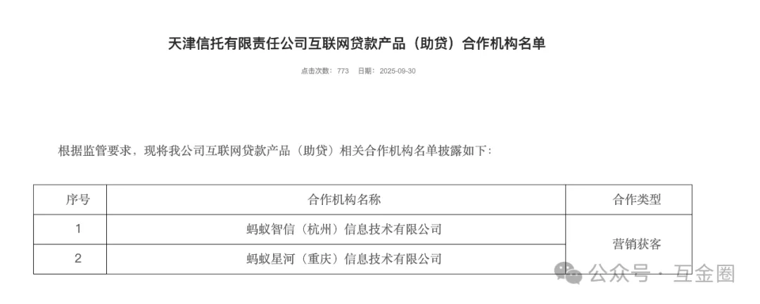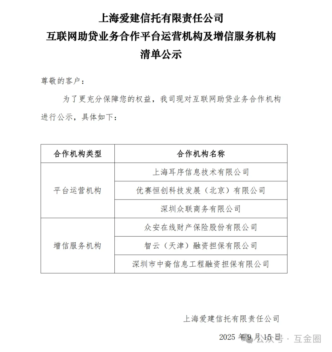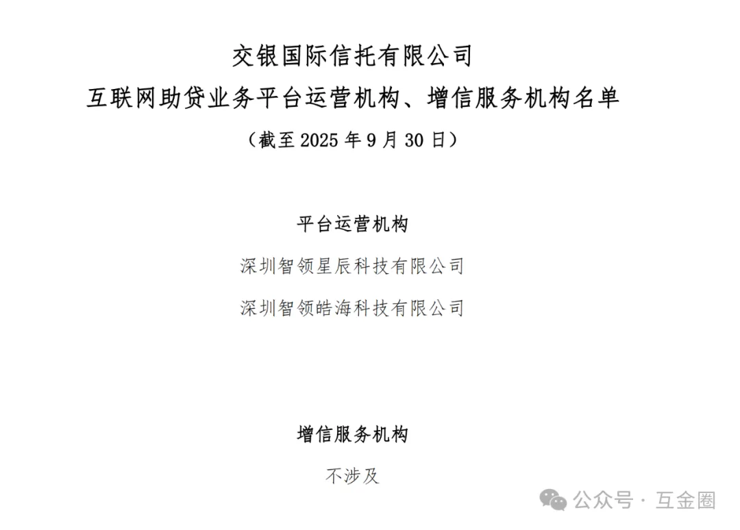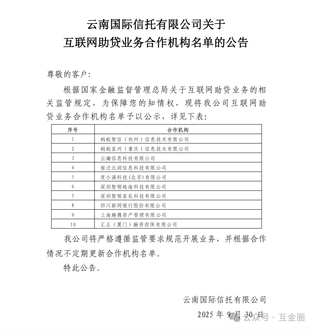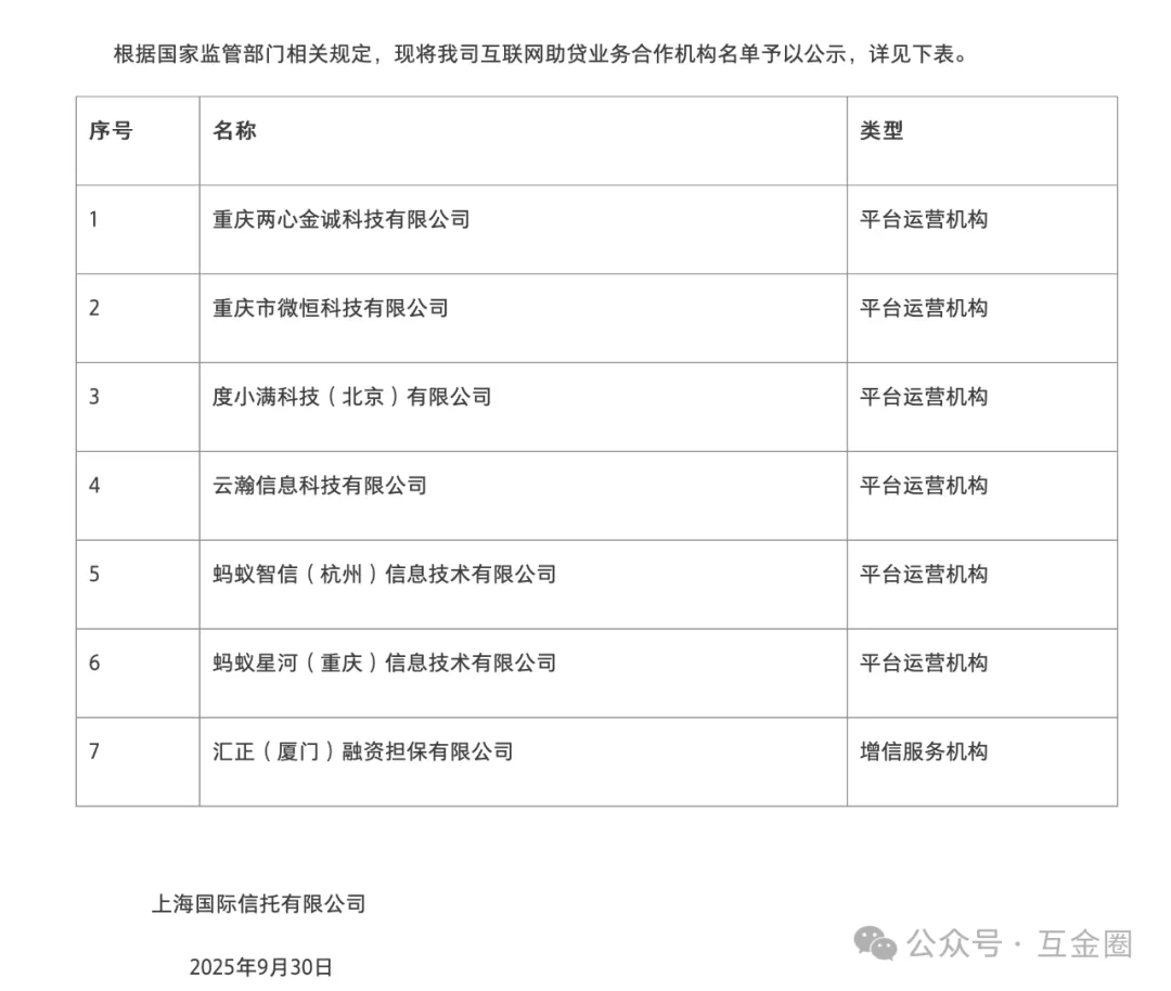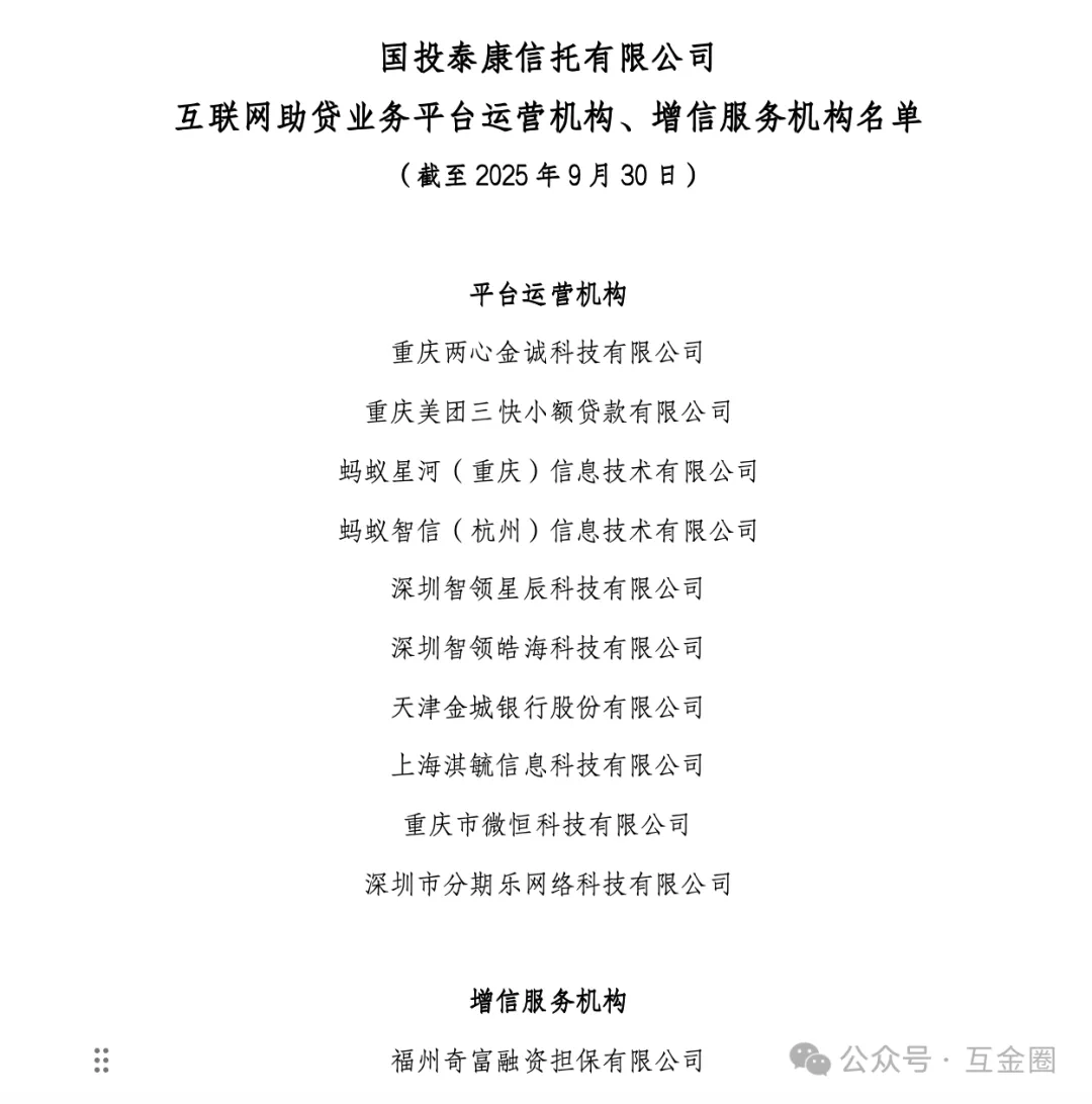 截至2025年10月,仅国投泰康信托、中诚信托、天津信托、上海国际信托、上海爱建信托、云南信托、交银信托、五矿信托披露了助贷业务合作机构白名单。