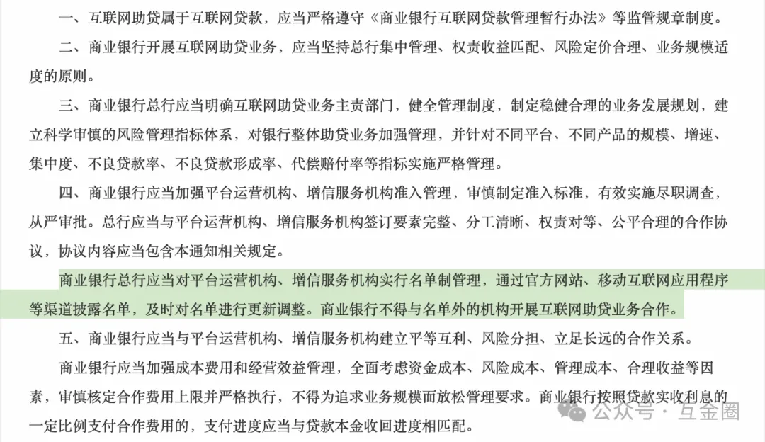《助贷新规》明确要求,“商业银行总行应当对平台运营机构、增信服务机构实行名单制管理,通过官方网站、移动互联网应用程序等渠道披露名单,及时对名单进行更新调整。”“外国银行分行、信托公司、消费金融公司、汽车金融公司参照执行。"不得与名单外的机构开展互联网助贷业务合作。