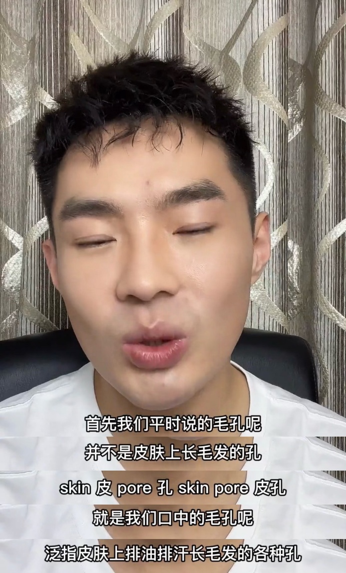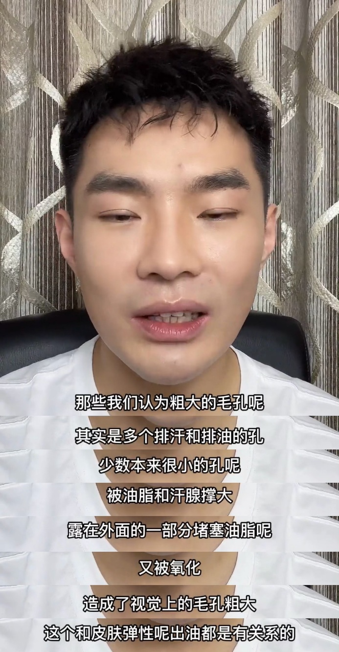 首先我们平时说的毛孔并不是皮肤上长毛发的孔,skin皮pore孔,skin pore皮孔,就是我们口中的毛孔,泛指皮肤上排排汗长毛发的各种孔,这些我们认为粗大的毛孔其实是多个排汗和排油的孔,少数本来很小的孔被油脂和汗线撑大,露在外面的一部分堵塞油脂又被氧化,造成了视觉上的毛孔粗大,这个和皮肤弹性出油都是有关系的。