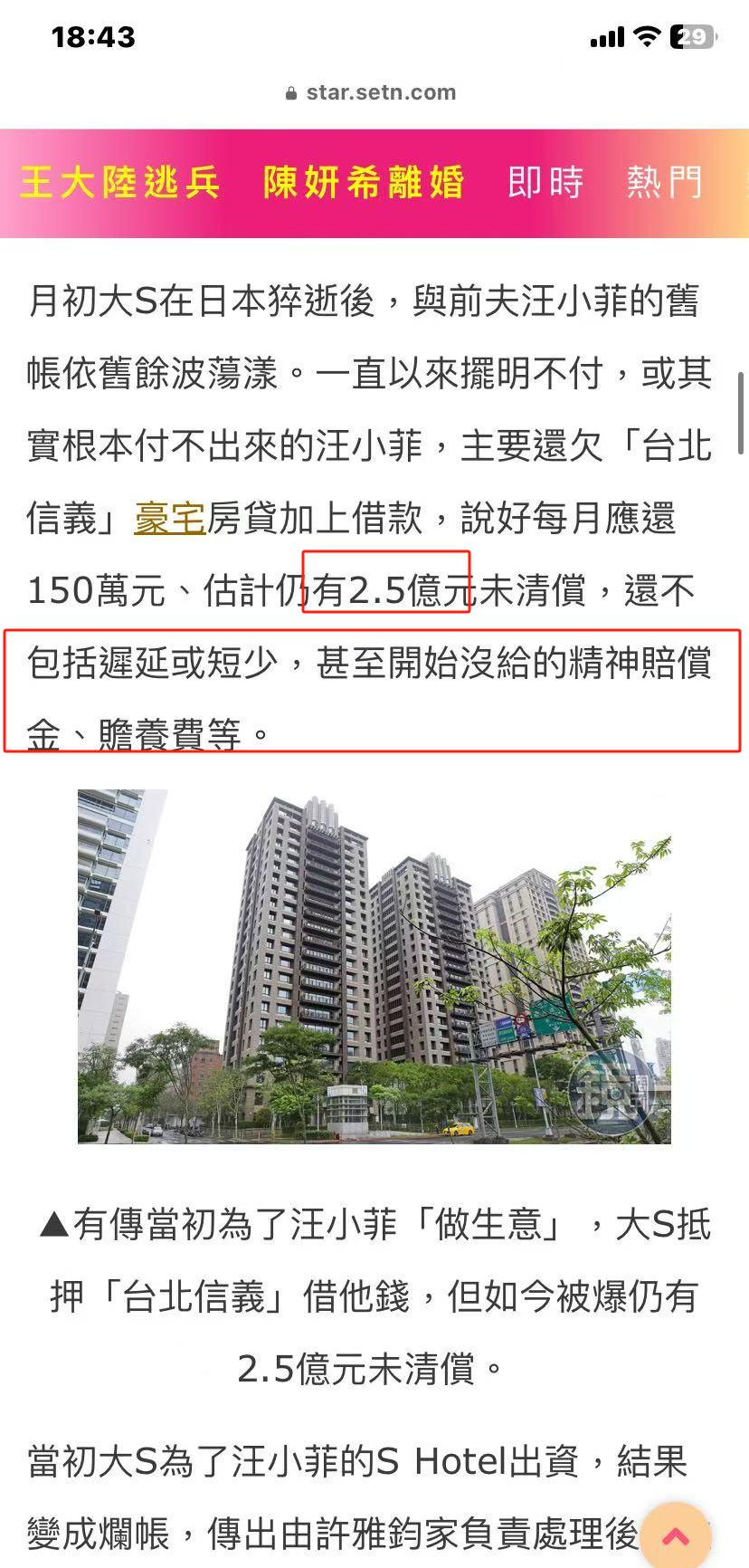 而其他的占比很大部分的就是大S在台湾的房贷,还有台媒爆料的赡养费和精神损失费等,这些加起来总共有2.5亿没有结清。