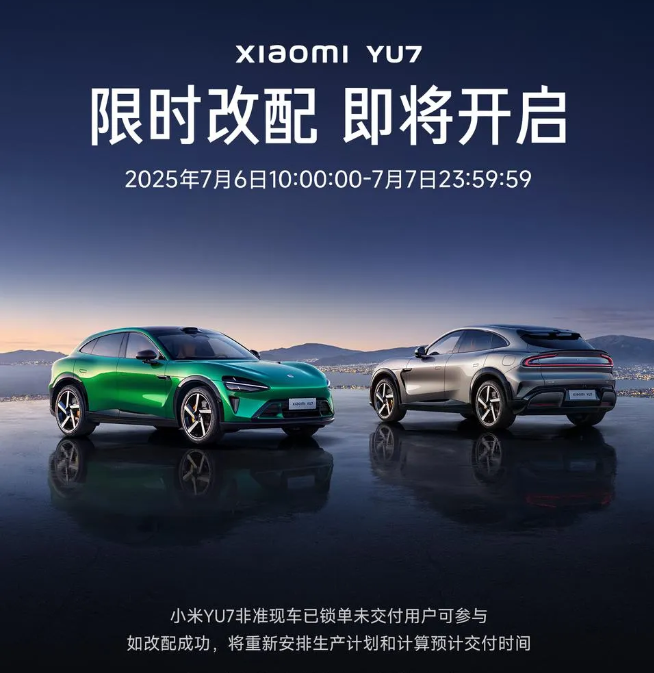 就在刚刚,小米汽车官方宣布,小米YU7车型将开启限时改配服务。此次改配服务的时间为7月6日上午10:00至7月7日晚上24点,锁单用户(非准现车)均可参与。具体改配规则和流程已在小米汽车APP中详细说明。