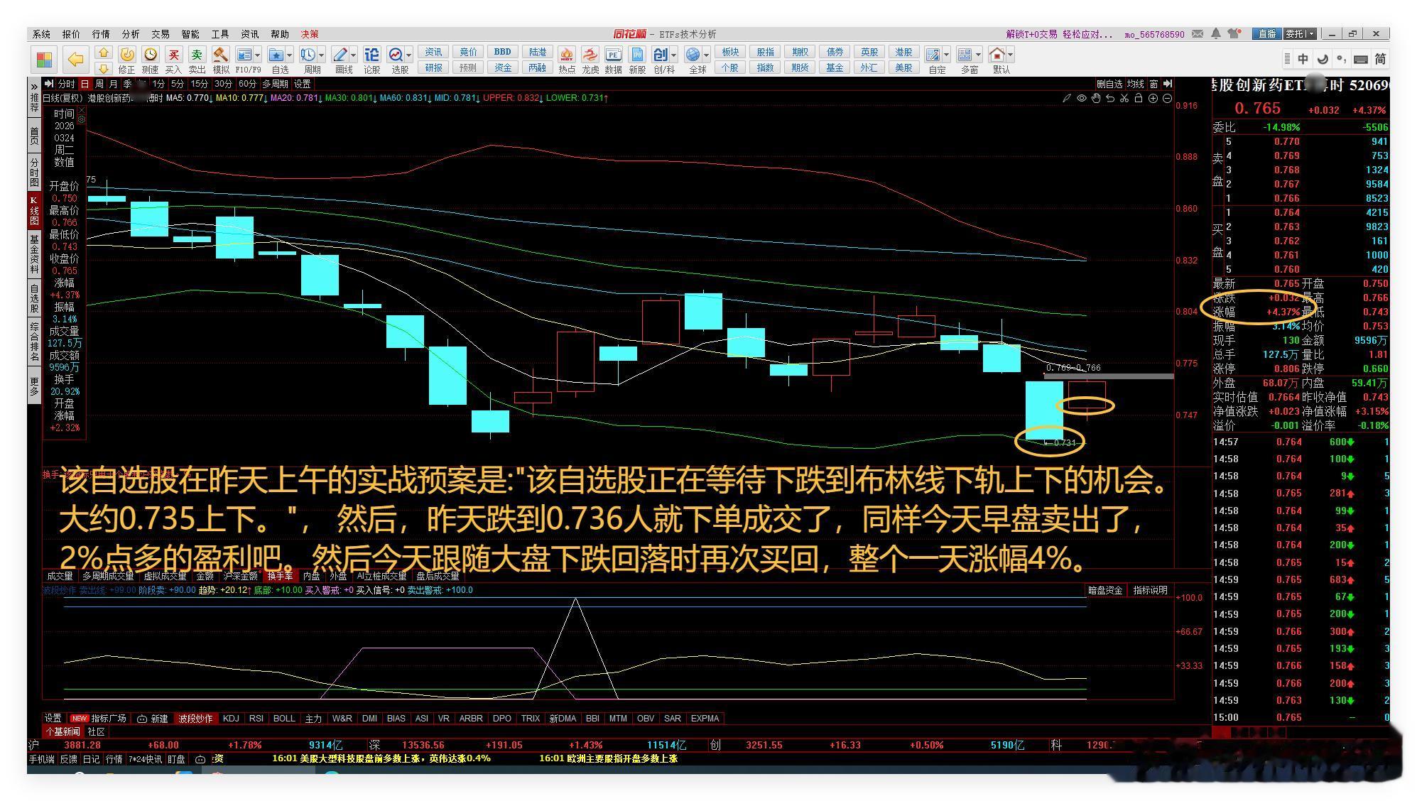 该自选股在昨天上午的实战预案是:"该自选股正在等待下跌到布林线下轨上下的机会。大约0.735上下。", 然后,昨天跌到0.736人就下单成交了,同样今天早盘卖出了,2%点多的盈利吧。然后今天跟随大盘下跌回落时再次买回,整个一天涨幅4%。如下图所示: