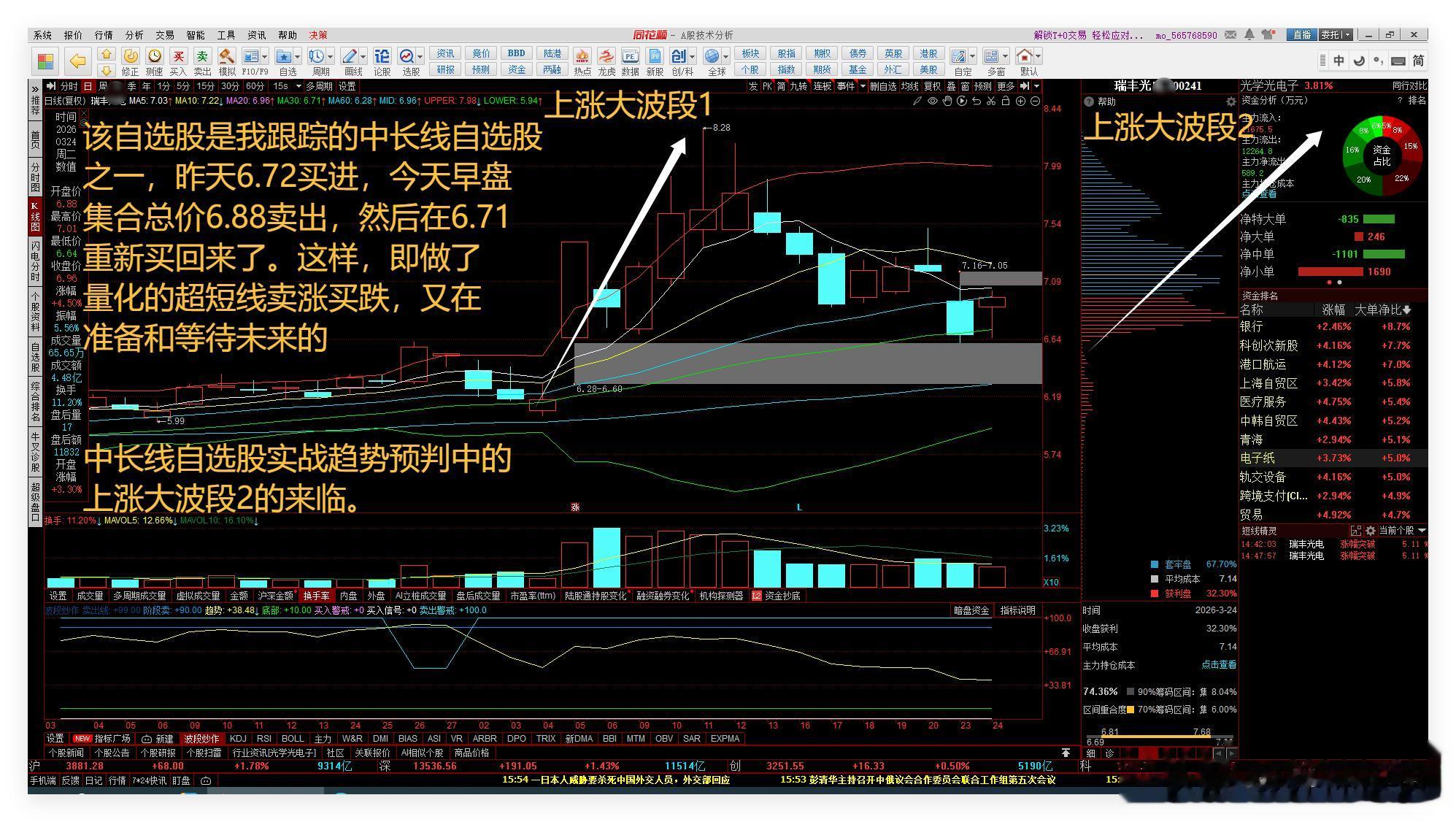该自选股是我跟踪的中长线自选股之一,昨天6.72买进,今天早盘集合总价6.88卖出,然后在6.71重新买回来了。这样,即做了量化的超短线卖涨买跌,又在准备和等待未来的中长线自选股实战趋势预判中的上涨大波段2的来临。如下图所示: