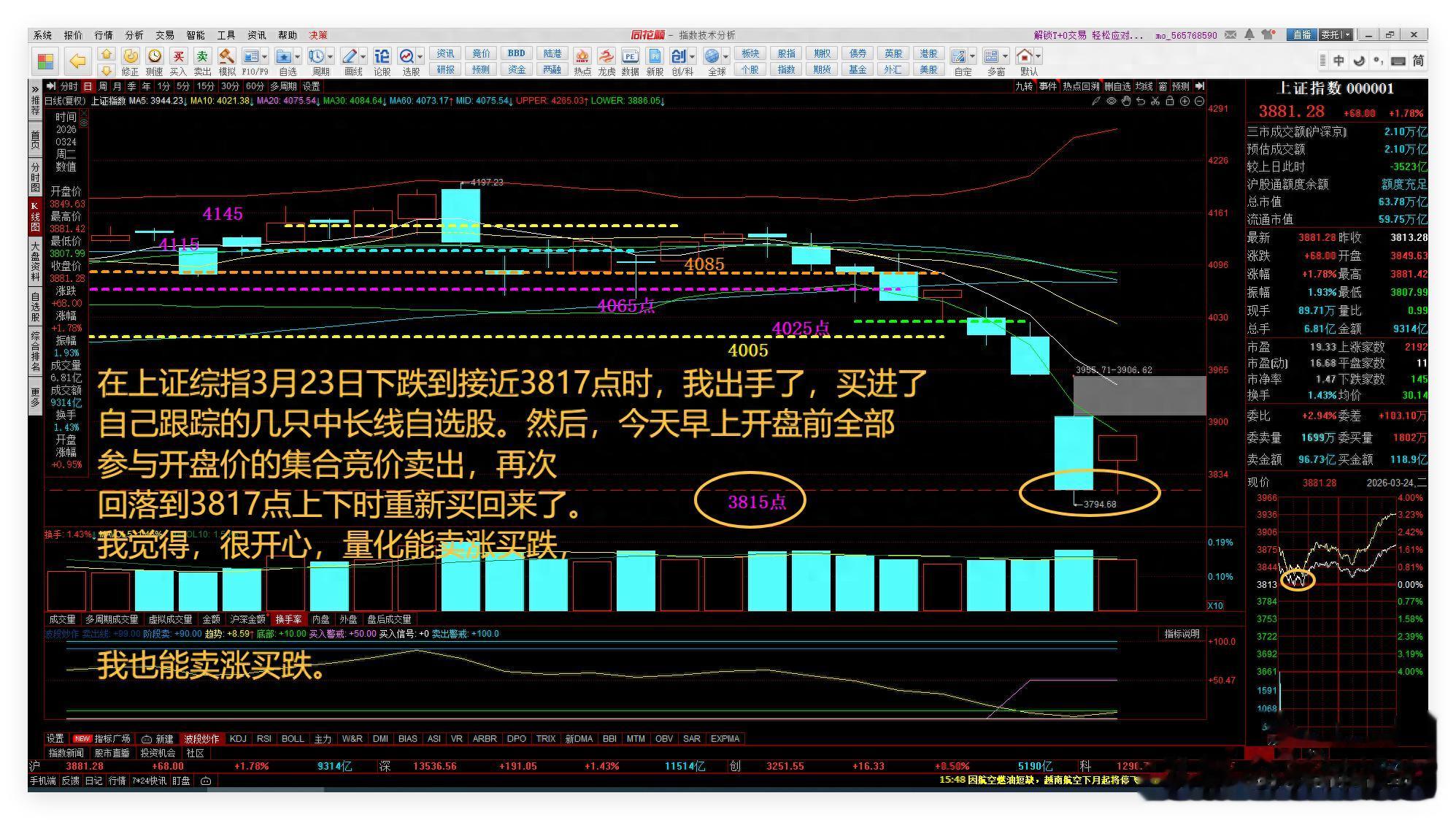 在上证综指3月23日下跌到接近3817点时,我出手了,买进了自己跟踪的几只中长线自选股。然后,今天早上开盘前全部参与开盘价的集合竞价卖出,再次回落到3817点上下时重新买回来了。