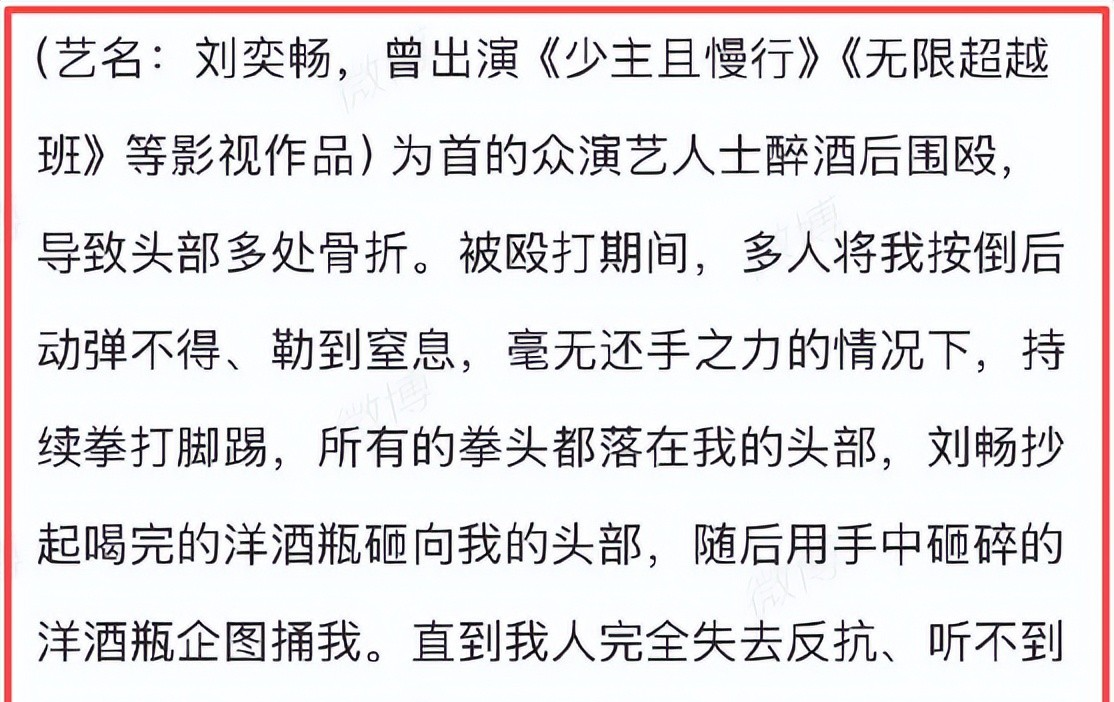 更甚至,刘奕畅不但用洋酒瓶砸到他头上,甚至想用碎掉的酒瓶子捅他。