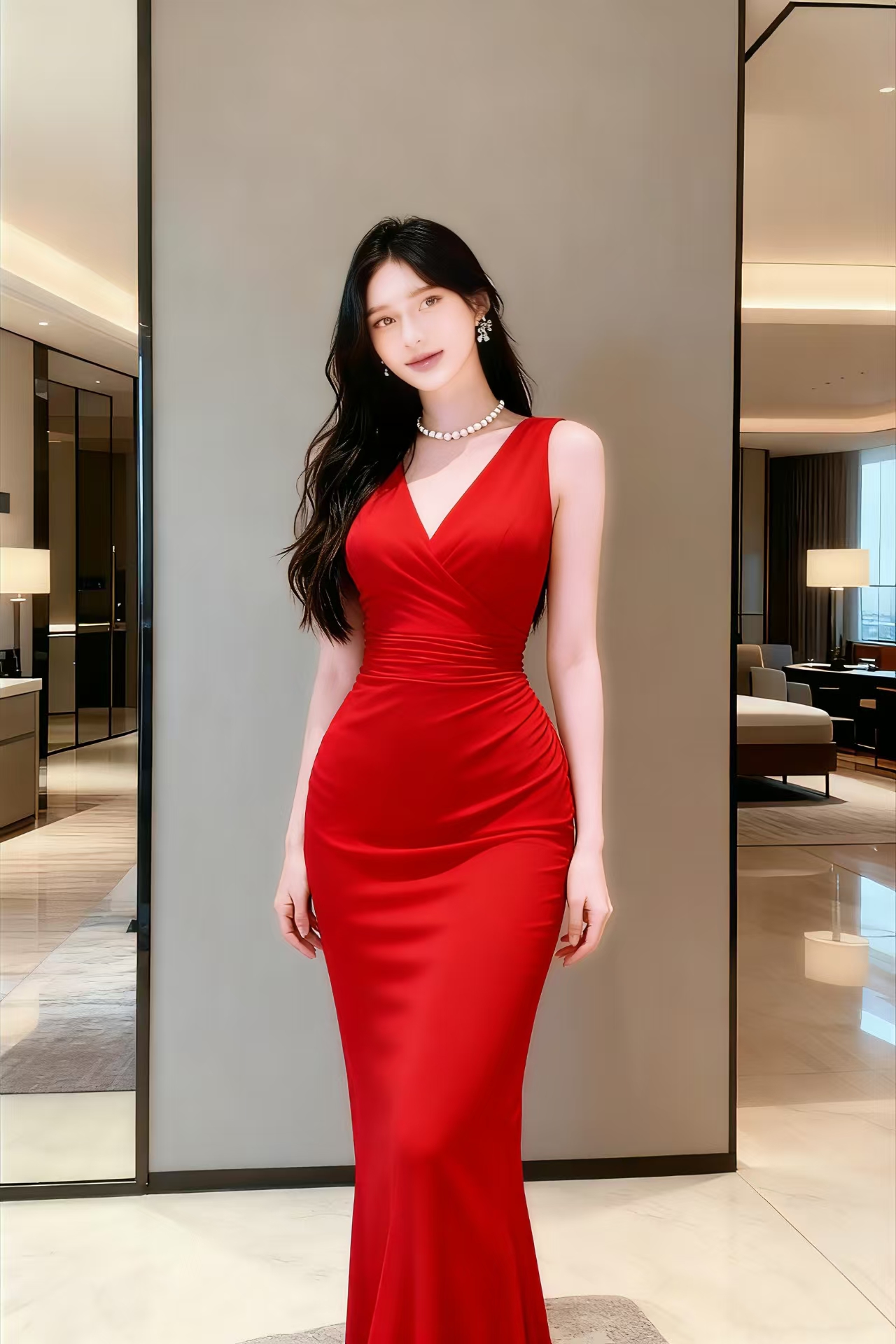 她身着一袭正红色无袖长裙,深V领设计衬得脖颈修长,胸前交叉的剪裁巧妙勾勒出曼妙曲线;