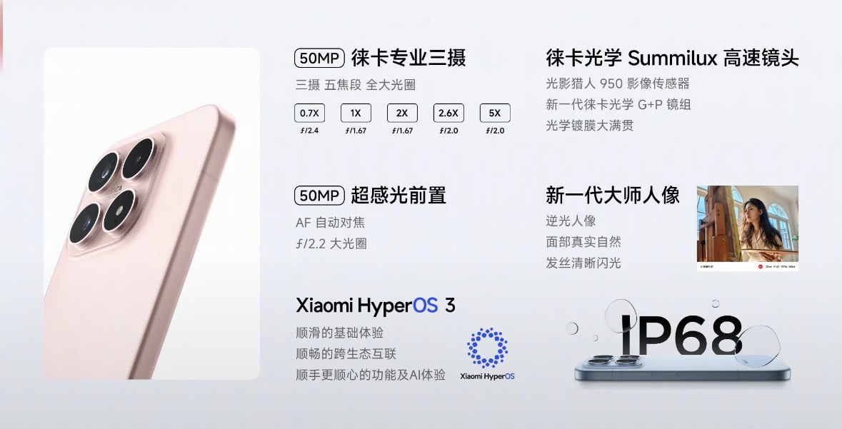 全焦段影像表现达到小米史上最佳水准,无论暗光、逆光还是复杂光线环境,画面都非常通透。特别是新一代大师人像模式,不仅人物肤色真实自然,发丝的处理水平也有大幅提升,媲美专业相机,根根分明。Xiaomi 17 前置相机采用 5000 万超感光相机,大底大光圈设计,自拍效果出色自然。