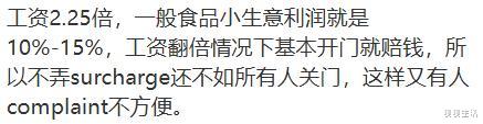 工资2.25倍,一般食品小生意利润就是10%-15%,工资翻倍情况下基本开门就赔钱,所以不弄surcharge还不如所有人关门,这样又有人complaint不方便