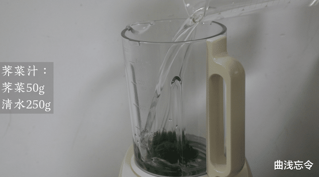 4、荠菜榨汁:将捏干水分的荠菜分出50g和清水250g倒入破壁机,搅打成汁,用过滤袋挤出荠菜汁。
