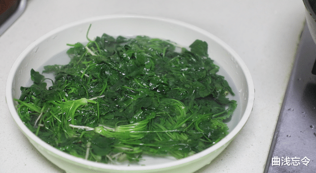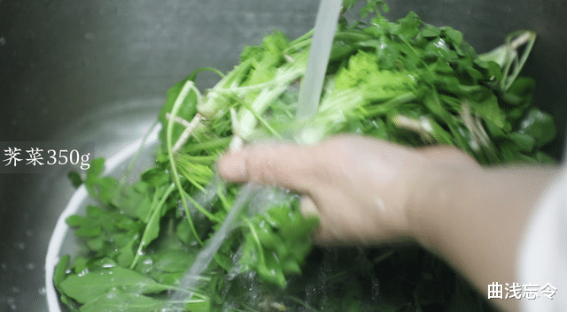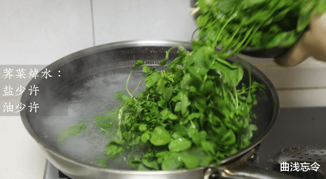 2.焯水时加适量盐和油,焯水时间不可太长,变软就捞出,马上过凉水,这些都可让荠菜能更好保持绿色。
