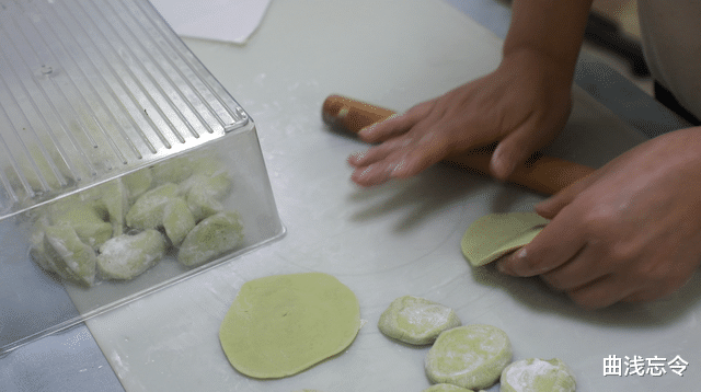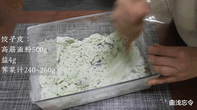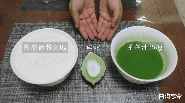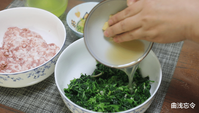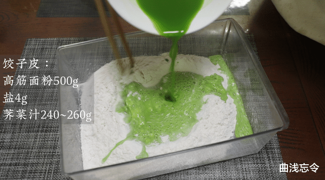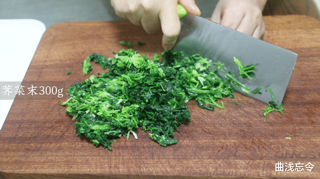 3.荠菜是分了两部分,一份切末做馅料,一份榨汁来和面。