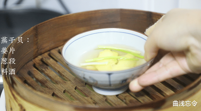 4.干贝可以提前一天清水浸泡,如果赶时间就加姜葱蒸30分钟蒸软。