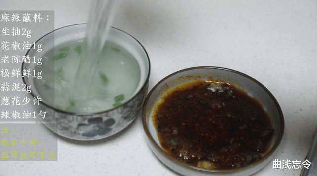 14、出锅,开吃!(麻辣蘸料):生抽2g、花椒油1g、老陈醋1g、松鲜鲜1g、蒜泥2g、葱花少许、辣椒油1勺。(汤):葱花少许、盐可放可不放。