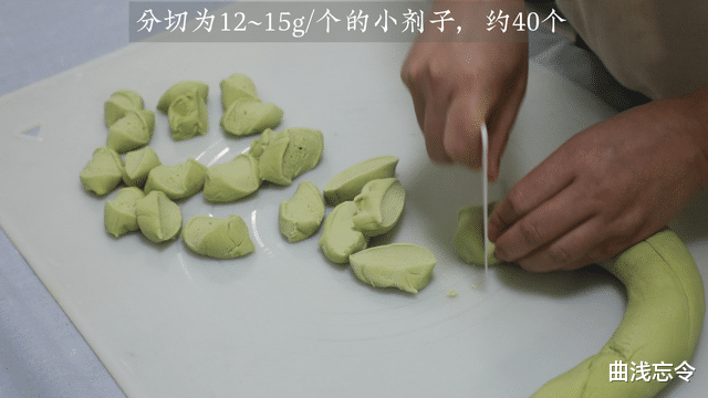 11、做饺子皮:松弛好的面团再次揉成长条形,分切成大约12~15g/个的小剂子,压扁擀成饺子皮。这里一共是40个。