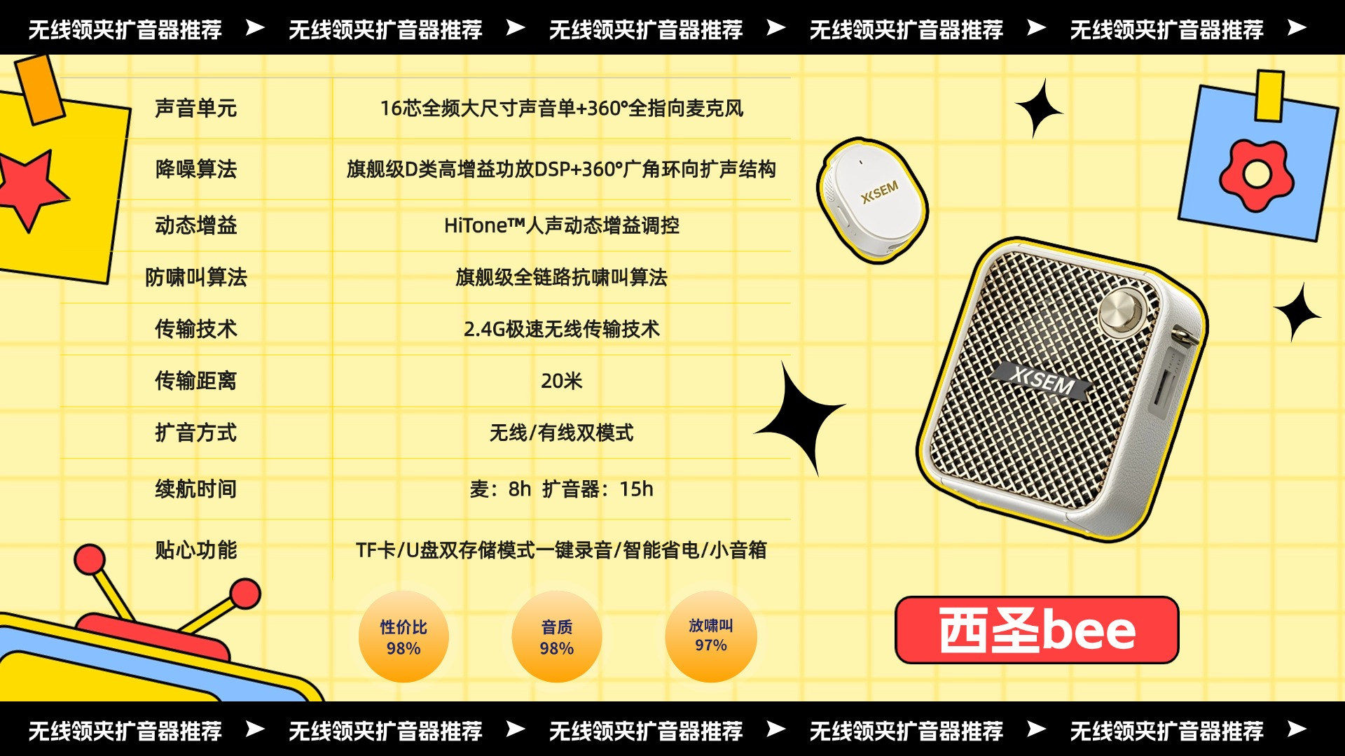 品牌背书:提到西圣,可能部分小伙伴不算熟悉,但在声学领域,它可是实打实的“技术老牌”!不同于靠流量堆砌的网红品牌,西圣早期技术团队就深耕声学与扩音领域研发,曾为全球数十款知名音频产品提供核心调校方案与技术支持,积累了超10年的声学优化经验。在扩音设备领域,西圣更是凭借严苛的品控标准和创新技术,多次获得行业内“年度优质声学设备”“用户信赖扩音品牌” 等奖项,还通过了欧盟CE、英国 UKCA 等多项国际品质认证,每一款产品上市前都要经过上百次声学调试与环境测试,确保在不同场景下都能稳定发挥——正是这样的技术沉淀与品质坚守,让西圣Bee刚推出就收获了教师、主播、导游等专业人群的高度认可,成为同价位里“闭眼入”的口碑之选。