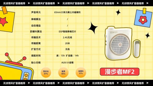 品牌背书:漫步者是音频领域知名品牌,在声学产品上积累深厚,主打高性价比,适配教师上课、主播直播等日常场景,用户认知度高。MF2作为基础款,无冗余功能,以轻量设计和续航为亮点,满足日常扩音需求。