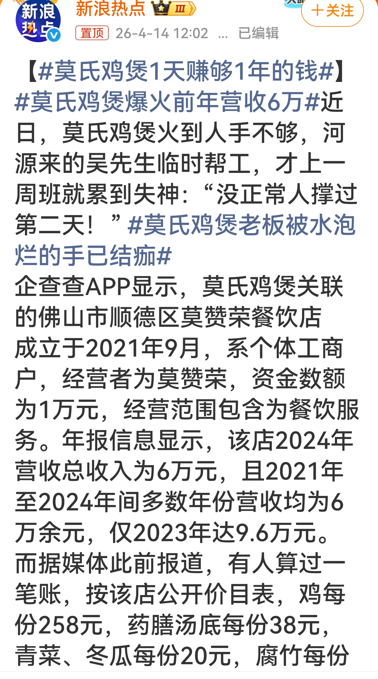 最近莫氏鸡煲彻底火出了圈,这家藏在佛山的小餐饮店,原本一年营收才6万,结果爆火之后日均营业额直接冲到6万,一天就赚够了过去一年的钱,堪称现实版“一夜暴富”。