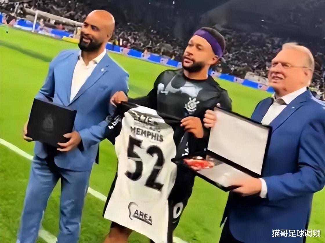 俱乐部主席奥斯马尔·斯塔比莱与足球总监法比尼奥·索达多亲自入场,将印有“52”号的特制战袍与纪念奖牌交到孟菲斯手中。球场大屏同步播放他历年来为“橙衣军团”轰入世界波的集锦,近46,000名科林蒂安球迷用掌声把现场气氛推至顶点。