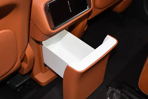 车身侧面线条修长,5205mm 的车长配上 1996mm 的宽度,比例拿捏得刚好,既不笨重,又不失大气。21 英寸的大轮毂造型独特,和整车风格很搭,跑起来稳,视觉上也提气。弹出式门把手不光好看,对降低风阻也有实际帮助,官方公布的风阻系数是 0.258,在同级别里算优秀的,这直接关系到高速巡航时的能耗表现,跑长途能省不少电。