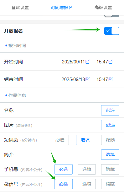 设置活动时间:规定好投票的开始和结束时间,开启在线报名(选做):要是想让大家自主报名,就开启这个功能,需审核,保证报名质量(还可以设置报名信息呢)。