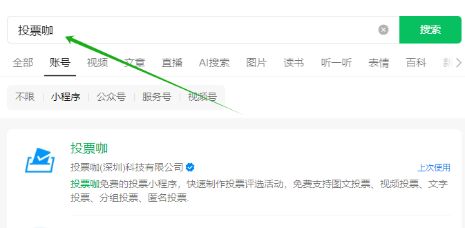 打开微信点击上方的在搜索框,然后输入“投票咖”,然后点击对应的小程序,2秒就能进入首页,不用注册超方便!