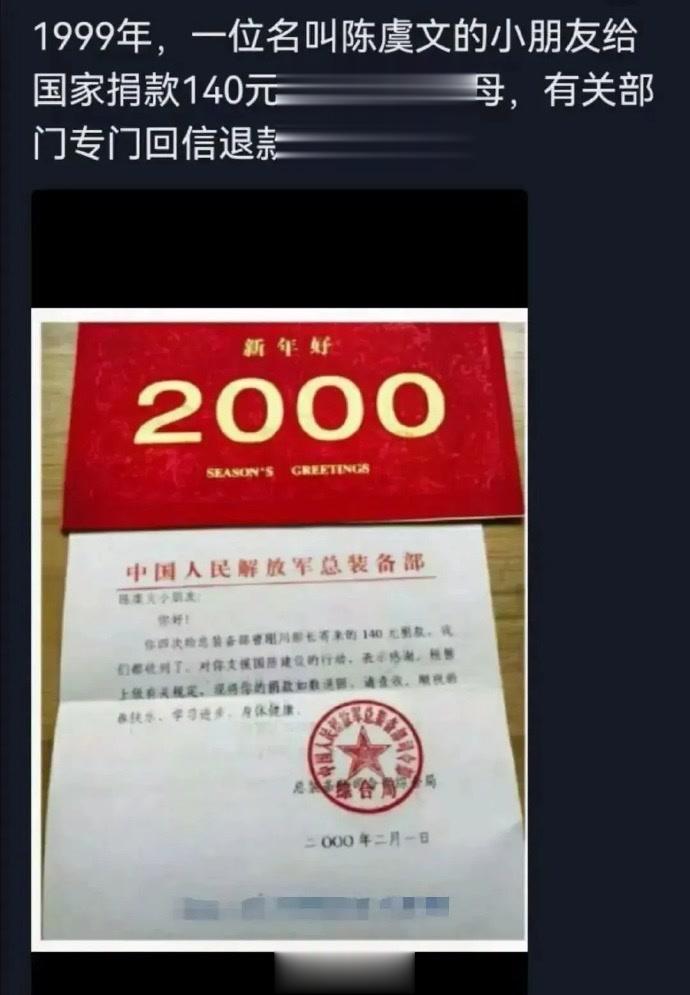 2000年初,陈虞文收到回信,总装备部将他捐的钱退了回来,还随信寄来一张新年贺卡。信中写道:“陈虞文小朋友:你好!你四次给总装备部寄来的140元捐款,我们都收到了,对你支援国防建设的行动,表示感谢。根据上级有关规定,现将你的捐款如数退回,请查收。顺祝新春快乐,学习进步,身体健康。”