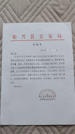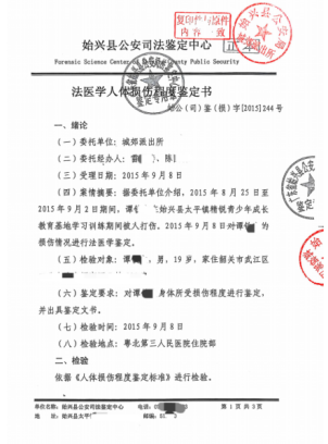 2015年8月4日.谭钦文(19岁)因网瘾叛逆,被韶关精锐学校5名教官到家强行押送到该校学习,9月4日父亲到校接人时发现