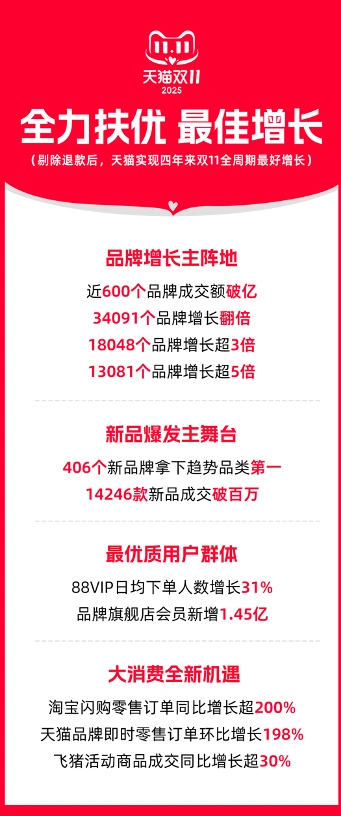 2025年天猫双11,实现四年来最好增长。双11全周期,近600个品牌成交破亿,34091个品牌同比去年增长翻倍,18048个同比增长超3倍,13081个同比增长超5倍,均超去年同期。其中,苹果、海尔、美的、小米、骆驼、华为等品牌破10亿。