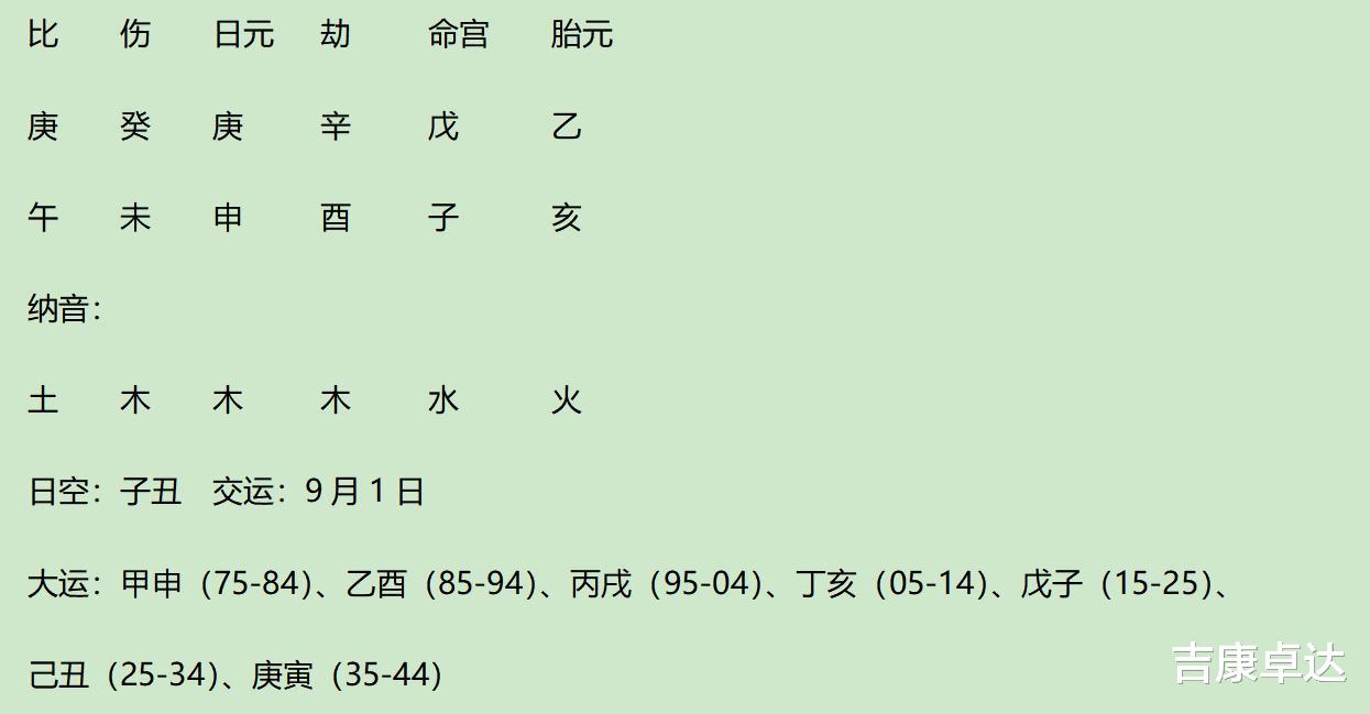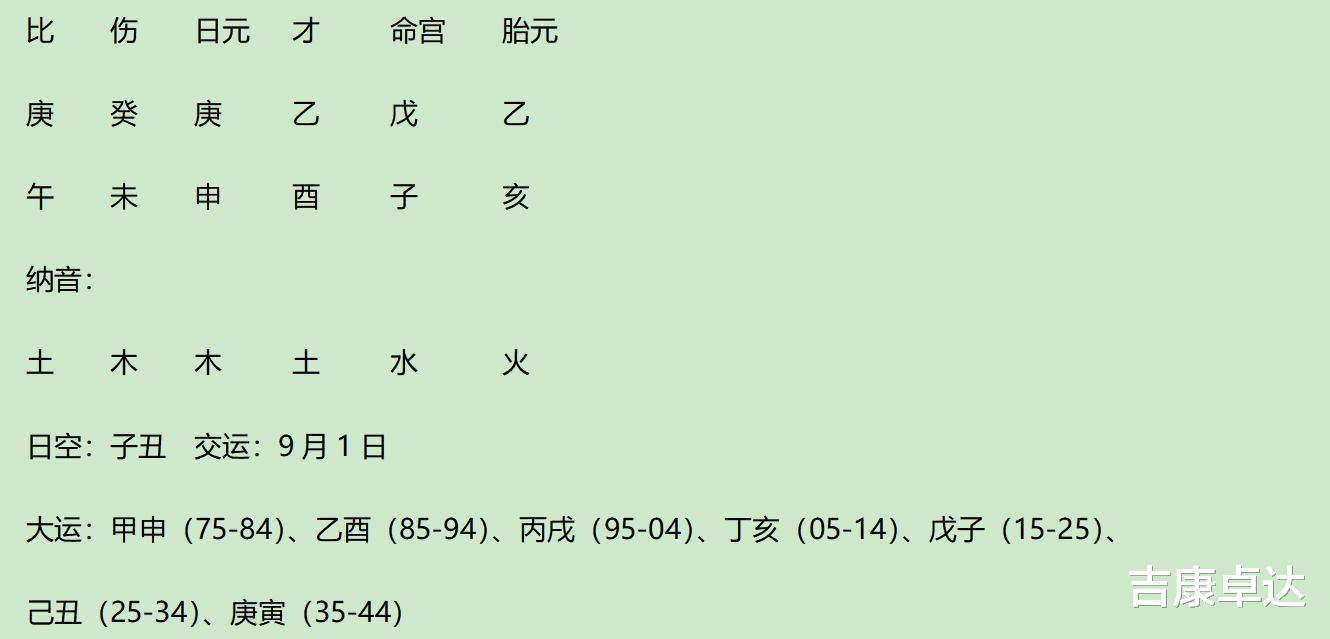 庚寅运(1935-1944),庚比合乙财,寅合午;比夺财,一般之运。