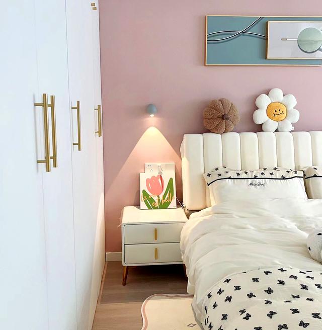 主卧床头背景墙刷成了褐珊瑚色,而在床尾一侧墙面刷成了杏子灰,两个颜色搭配在一起,一点都不会违和;