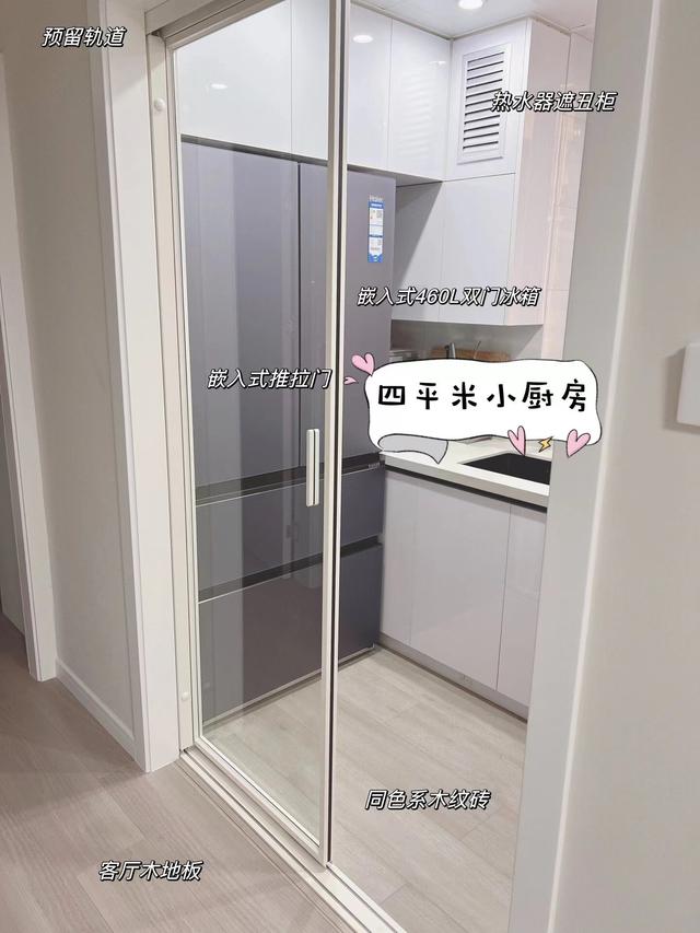 虽然空间非常小,但是屋主依旧选择了封闭式厨房,而厨房和其他功能区之间,则安装了玻璃推拉门,日常烹饪的时候,将推拉门一关,就可以将油烟全部隔绝,避免它们乱窜,而且选择了透明的推开门,光线也可以穿过玻璃,直接投射进来。