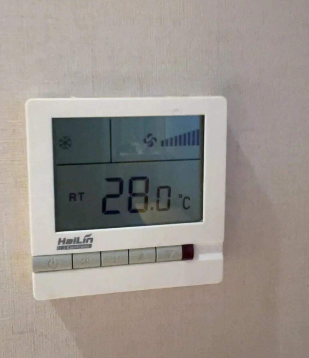 走向控制面板,哔——浓重的空调味道袭来,温度调节键毫无反应,上下调试,面板都始终保留在28℃的设定,风量只在“静音”和轰鸣之间切换,试着更换了一下模式后,出风口直接停止出风了,房间变成了一个密不透风的盒子。