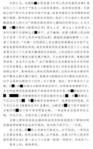 然而,一、二审判决书对证明房产属于夫妻共同财产的关键证据均不作明确回应与认定,对房屋权属性质也不作明确认定。对此,陈先生不服判决,在二审判后申请书面答疑。在后续电话答疑中,在陈先生反复要求明确101号房屋的权属时,二审主审法官刘某才明确表示,合议庭认可101号房屋属于夫妻共同财产,但审理范围只限于离婚协议书的约定;同时,合议庭也认可王某将名下唯一具有实际价值、约1200万元的有效股票财产转移给配偶胡某的事实,但却认为此举不构成可撤销情形,而应视为对子女的“照顾”。