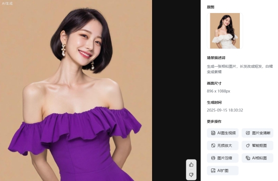 而其AI万能改图功能,只要你提供一张图片,和一段需求描述,便可以按照你所想的方案,修改你提供的图片,无论是画质修复、细节优化,还是换背景、换衣服、换个色调之类的功能,它都能一键帮你搞定。