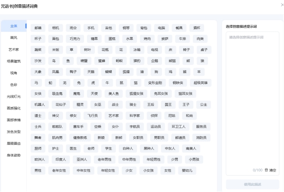 而且,对于刚接触AI绘画,不知道如何准确描述画面的用户,易可图还贴心地提供了一本咒语书。这本咒语书内置了大量关于主体、画风、场景、视角、色彩、光线乃至角色表情和姿态的关键词,你可以在这里自由组合,像搭积木一样轻松构建出自己想要的画面指令,大大降低了使用难度。无论是想生成一个独特的Logo、一张活动海报,还是一幅富有艺术感的插画,它都能一键生成。