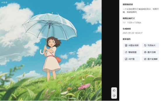 易可图是一个在线设计平台,虽然主攻的电商领域,但是它也提供了AI文生图,AI图生图(AI万能改图)的功能,生成的效果非常好。其中,AI文生图功能,只要通过输入简单的文字描述,比如“一个女孩在野外打着透明的雨伞,雨果天晴,宫崎骏画风”,点击生成,它就能快速生成我们要的图片。