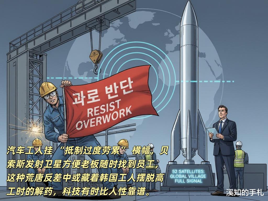 这边刚有汽车流水线工人将“抵制过度劳累”的横幅挂到龙门架上,大洋彼岸的贝索斯那边又啪嗒发射了52颗卫星,其目的是让“地球村”信号满满,也就是让老板能随时在任何地方找到你,哪怕你在珠穆朗玛峰的厕所里刷手机也能被找到。