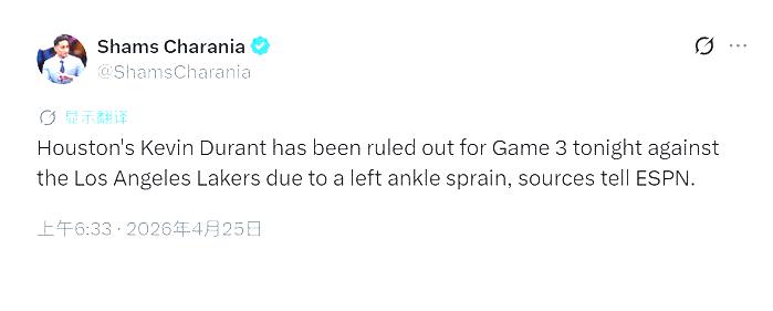 北京时间4月25日,NBA季后赛首轮G3战迎来火箭与湖人的G3战。不过,赛前,火箭传来不利的消息。据知名记者Shams权威报道,火箭核心杜兰特因左脚踝扭伤,在赛前热身结束后,正式确定缺席火湖人的G3对决。此前他一直被列为出战成疑名单,让无数火箭球迷抱着最后一丝侥幸,可最终的结果,还是给了身处绝境的火箭致命一击。对于已经0-2落后的休斯顿火箭而言,杜兰特的缺席,无疑让他们雪上加霜。