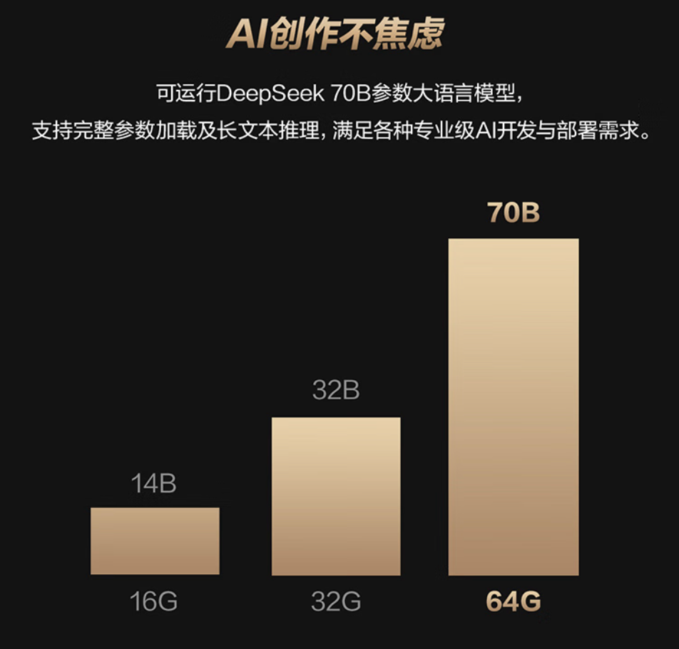 存储组合同样堪称旗舰级,至高配备 64GB LPDDR5X 7500MT/s 超高速内存和 2TB PCIe 4.0 SSD,还拥有双M.2 2280插槽,可满足后续存储扩容需求。超大内存可同时流畅运行 Pr、Ps、Blender等多款大型创作软件,即便是打开多个2GB以上的PS文件、编辑8K视频的同时开启AE渲染、AU音轨剪辑,也能轻松应对,告别内存不足、系统卡顿、素材加载缓慢等问题,让创作者专注于创意本身,无需被设备性能拖后腿。同时,它还能满足DeepSeek 70B参数大语言模型运行,支持完整参数加载及长文本推理,满足各种专业级AI开发与部署需求