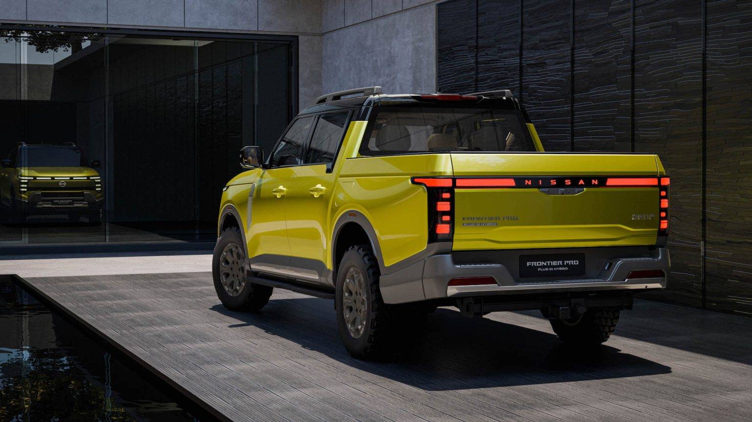 日产Frontier Pro PHEV在前格栅上方加入了封闭元素以凸显新能源身份。此外,PHEV车型还在车头上方加入了如同时空胶囊般的横贯式日行灯,凸显了新车的时尚感。