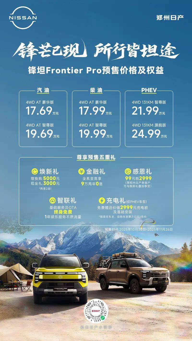 日前,我们从相关渠道获悉,郑州日产旗下全新皮卡车型——锋坦Frontier Pro将在11月27日晚间正式上市,此前公布的预售价区间为17.69-24.99万元。新车是日产首款在中国设计、研发和生产的全球车型,与日产Z9采用相同平台设计,动力部分将提供汽油、柴油以及插电混动供选。