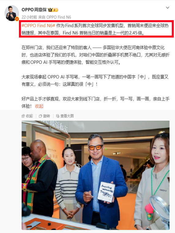 根据OPPO周意保的透露,海内外的广大消费者,都对新机无感折痕和AI手写笔体验,给予了高度的好评,甚至还获得了不少驻华大使的认可。