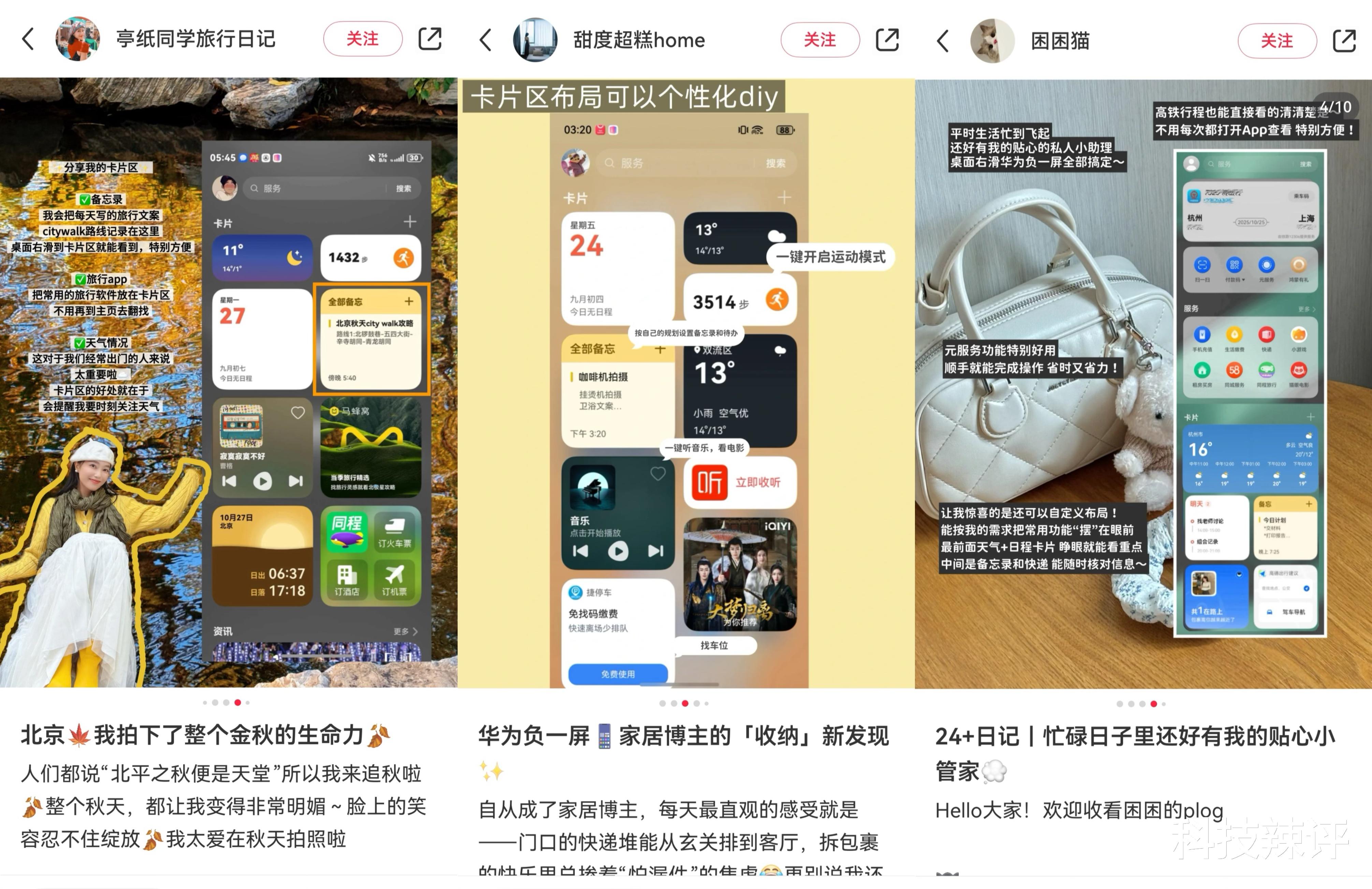 @亭纸同学旅行日记 用华为桌面负一屏这个出行好搭子打卡北京的秋天,出门前右滑即可查看天气,还有一触即达的备忘录卡片,既能随时调出整理好的citywalk路线,又能方便高效地记录旅行中的所思所想。马蜂窝卡片随时为她提供出游灵感、打卡攻略,让每个周末都不寂寞。