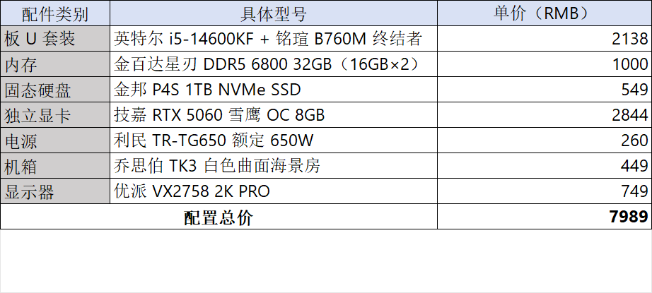 显卡:RTX 5060依然首选作为官方指导价2499的显卡型号,对付2K分辨率的3A大作基本上是无压力的,至于是16GB的5060Ti还是标准版的5060,则是完全看你的预算了,个人还是推荐支持个人送保的技嘉,其中雪鹰的型号依然是个人的心头好,虽然也确实是贵了不少。