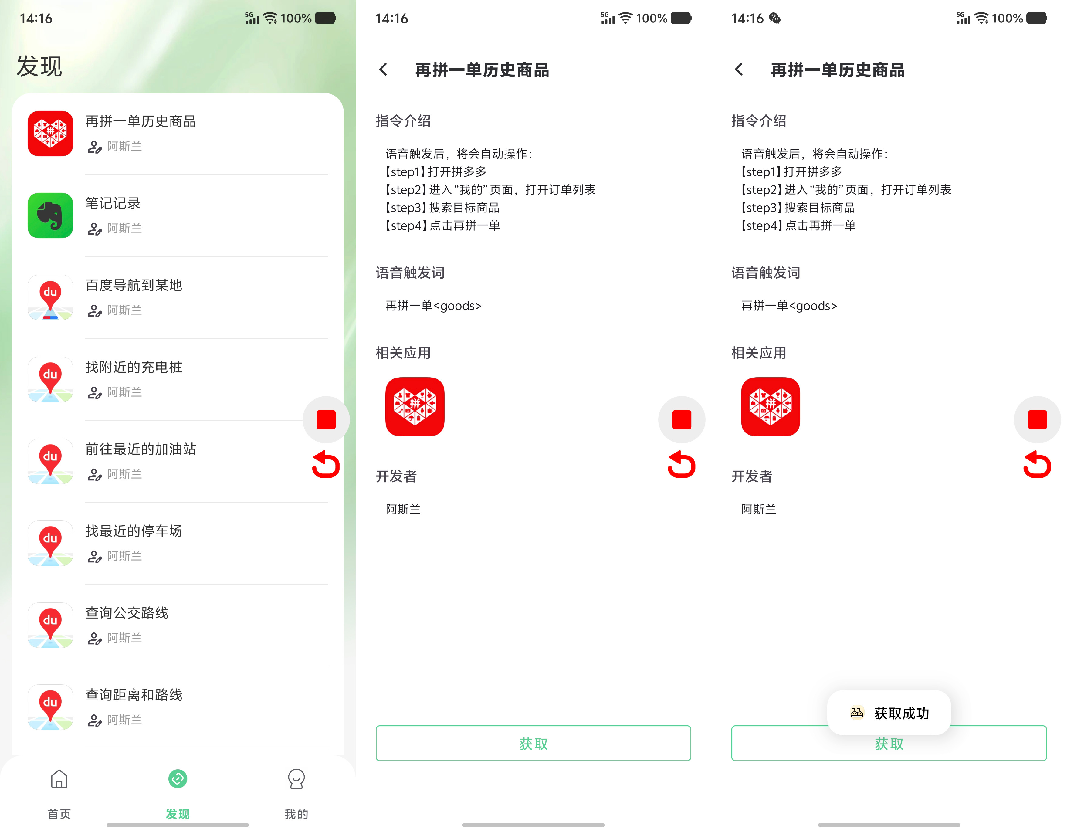 除了首页自带的那些便捷预设流程外,发现页才是这款软件的 仓库—— 这里汇聚了大量由其他用户分享搭建好的实用指令流程,覆盖的场景比首页丰富得多。随便点开一个感兴趣的流程,页面会清晰展示它的功能介绍、适用场景,甚至还有具体的操作步骤说明,让你一眼就能判断是否符合自己的需求。要是觉得这个流程好用,只需轻轻点击 “获取” 按钮,就能把它一键保存到自己的指令库中。后续想用的时候,不用再费心设置,直接调用就能轻松搞定,真正实现了 “拿来即用” 的便捷体验。