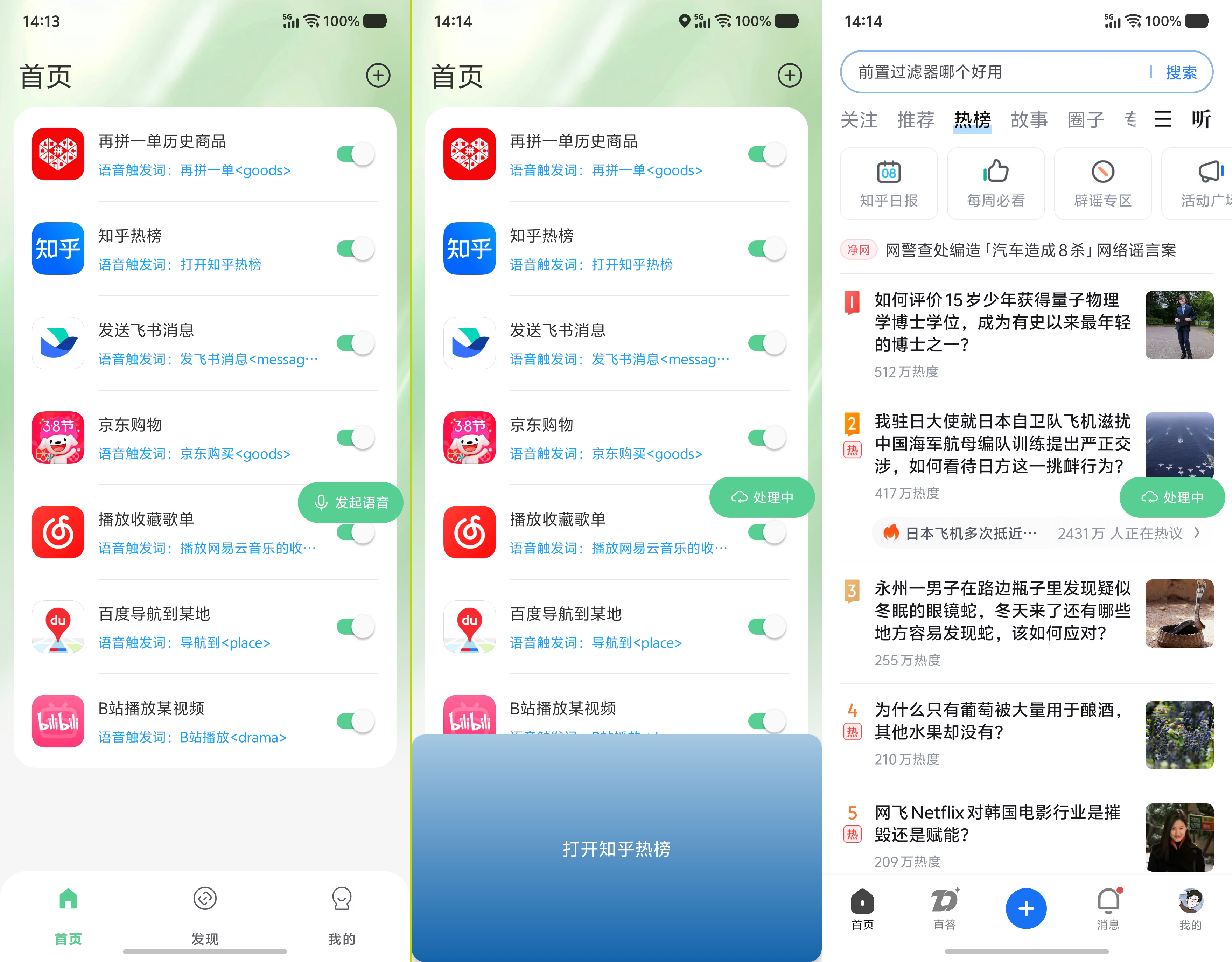 点开煎饺APP,界面设计简洁明了,底部导航栏只有三个核心选项:首页、发现、我的,没有多余的花哨功能,上手几乎零门槛。按照提示开启必要的权限后,就能解锁它的核心玩法了。点击页面显眼的麦克风图标,就能直接发起语音指令。我先试了试软件内置的快捷指令 ——“打开知乎热榜”,没想到语音识别的表现超出预期:不仅响应速度飞快,而且识别准确率很高,完全没有因为口音或者语速问题出错。指令发出后,神奇的一幕出现了:手机自动跳转打开知乎 App,紧接着又精准定位到热榜页面,全程不需要手动触碰屏幕一下。看着手机自己一步步完成操作的样子,瞬间就 get 到了豆包手机助手技术预览版的丝滑体验。