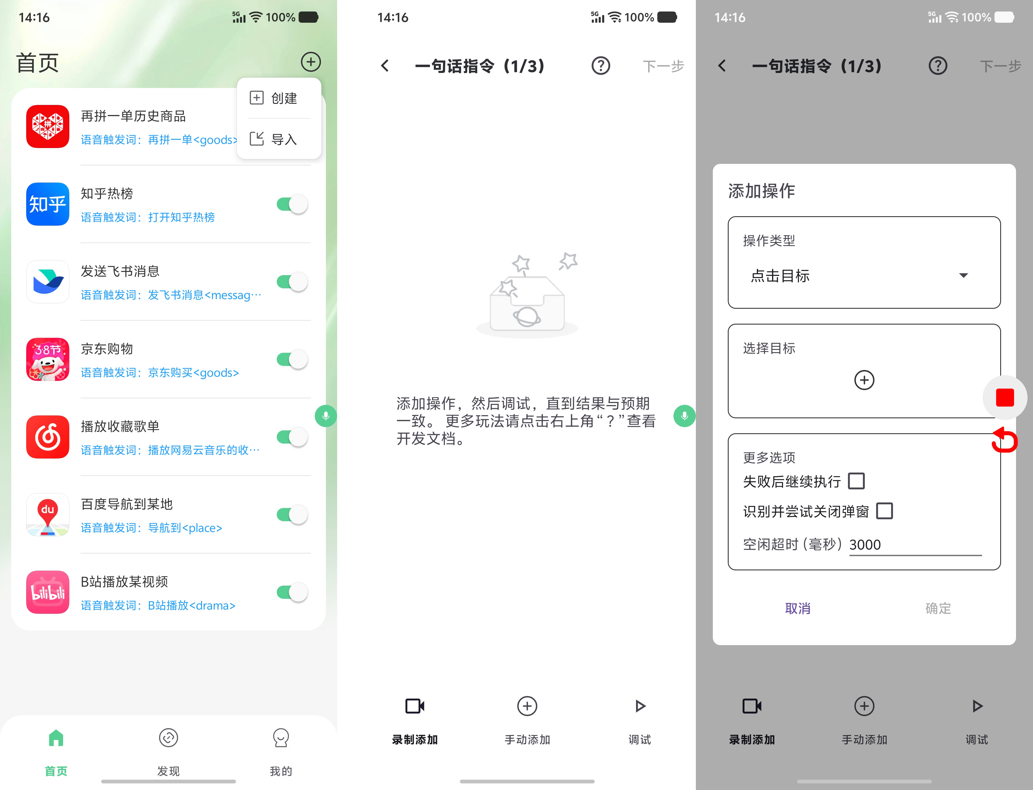 除了软件自带的快捷指令、以及从发现页获取其他用户分享的现成流程之外,煎饺还贴心地开放了自定义创建和外部导入两大功能,彻底打破了指令使用的局限性。在指令创建方面,它提供了两种超实用的方式:一种是录制添加,只需开启录屏功能,跟着自己的操作步骤走一遍,软件就能自动学习并复刻整个流程,生成对应的语音指令,零基础也能轻松上手;另一种是手动添加,可以根据自己的使用习惯,一步步设置操作逻辑、触发条件和执行步骤,精准打造专属于自己的个性化指令,让每一个操作都严丝合缝地贴合需求。自带预设、他人分享、自主创建,这三重指令获取渠道环环相扣,不仅让软件的功能覆盖面变得无比宽泛,更让它的实用性实现了质的飞跃。