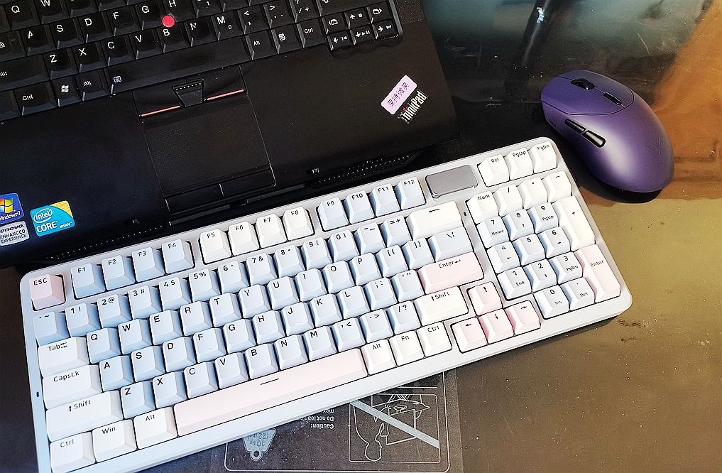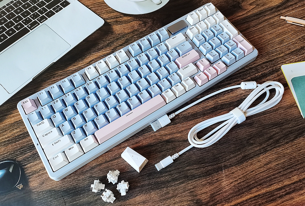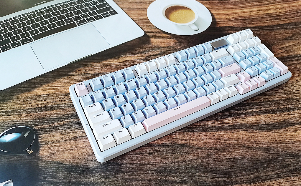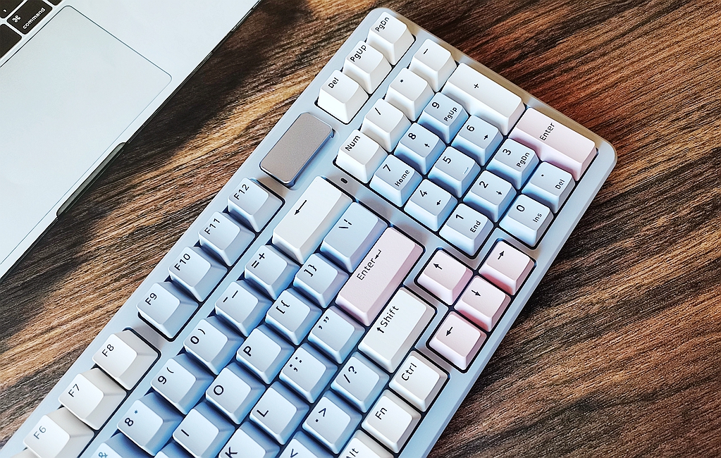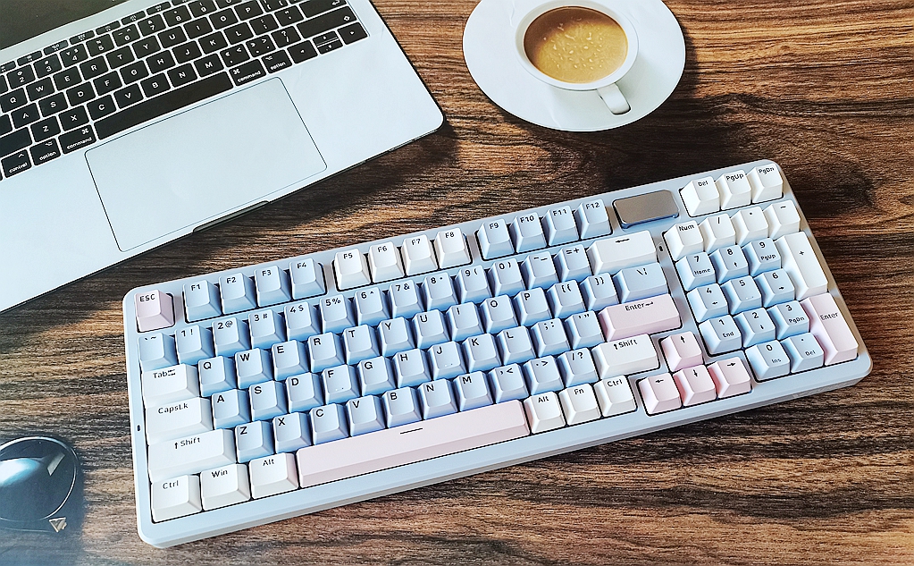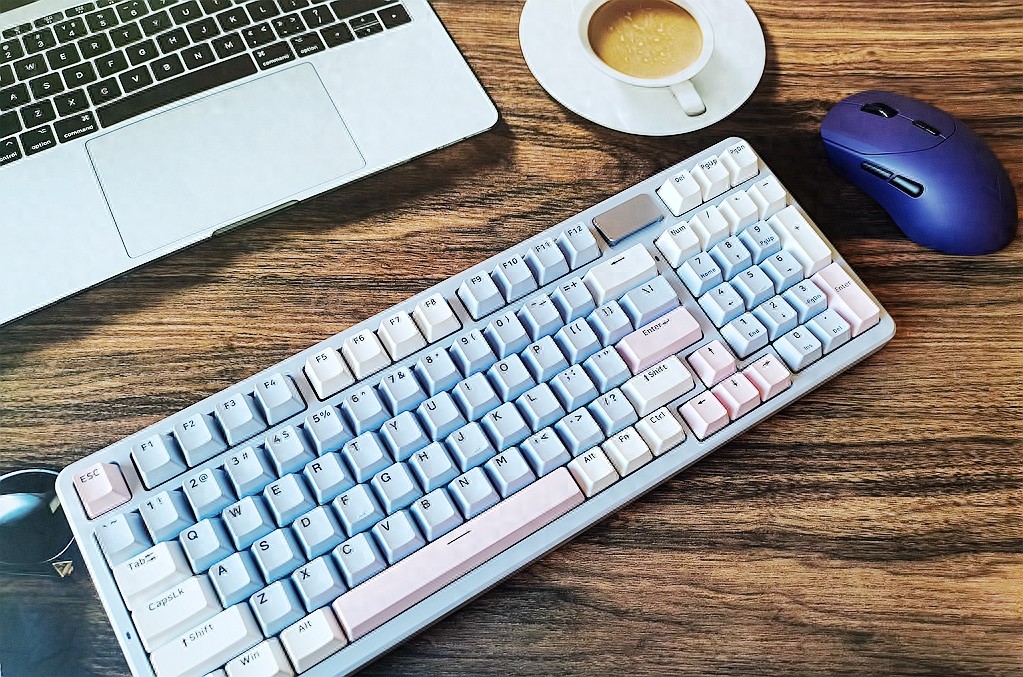 整体键盘采用98配列组合,在键位功能几乎和全配列无异的同时,缩减了长度,让键盘的横向布局更加紧凑。这种设计不仅使键盘的长宽比更加均衡,也释放了更多桌面空间,供鼠标移动。