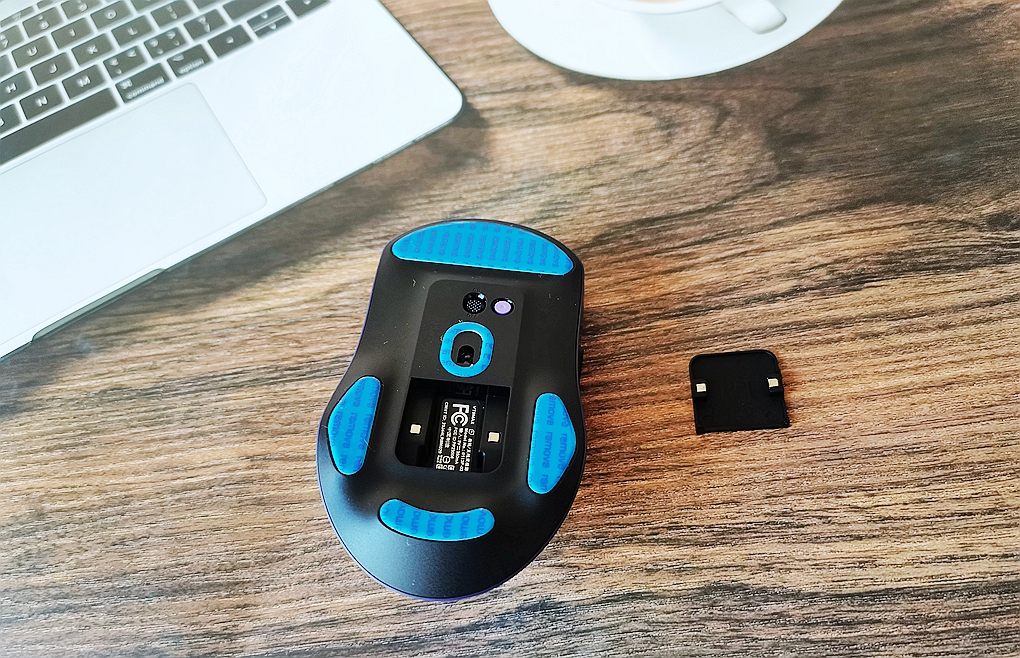 鼠标背面设计有3处特氟龙脚垫,中间是电源开关,玫红色DIY独立键、接收器收纳仓(兼顾磁吸式无线充电卡槽+触点)。特氟龙脚垫,能够有效减小摩擦力,滑动时会更加流畅,而且非常耐磨。玫红色DIY独立键,借助驱动可以进行丰富的自定义设置,比如回报率切换,宏切换等功能,简单便捷且实用。接收器也可以收纳在鼠标放置口内,外出携带不易丢失。