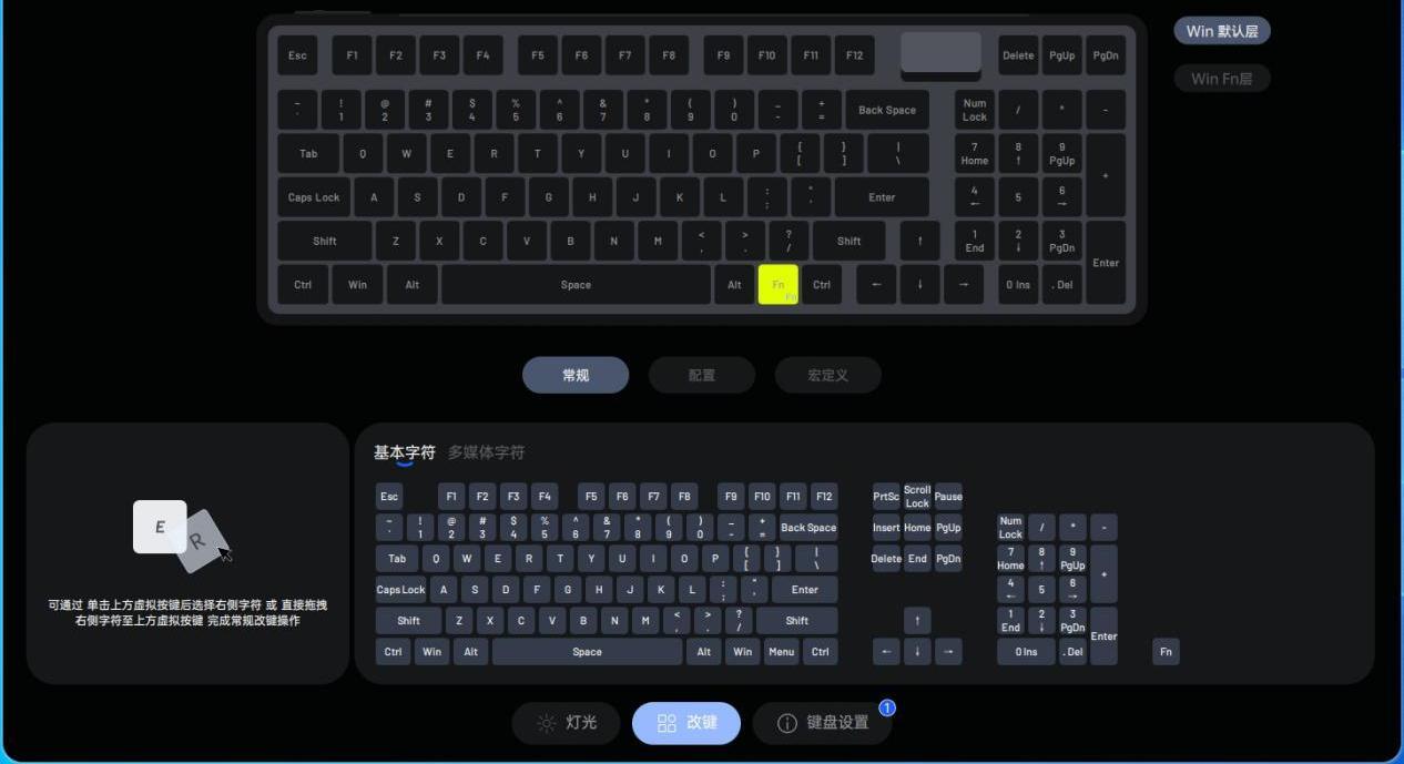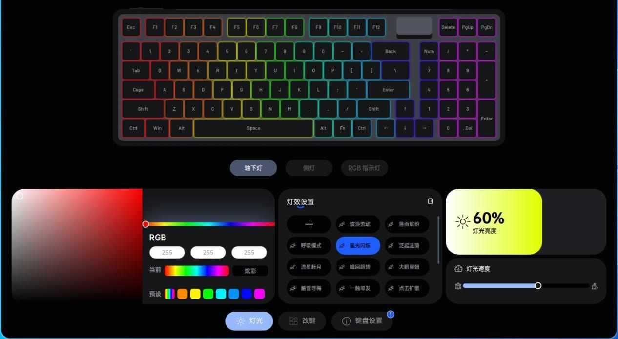 设计方面,右上角设计了一块由倾斜的磁吸盖板和多功能装饰灯组成的小空间,打开盖板后,内部收纳了USB接收器。巧妙的将接收器放置在键盘正面,一方面更加方便取用和收纳,另一方面巧妙的设计也提升了键盘的颜值。装饰灯通过Fn+空格可查看剩余电量,搭配的驱动还可自定义颜色、亮度。